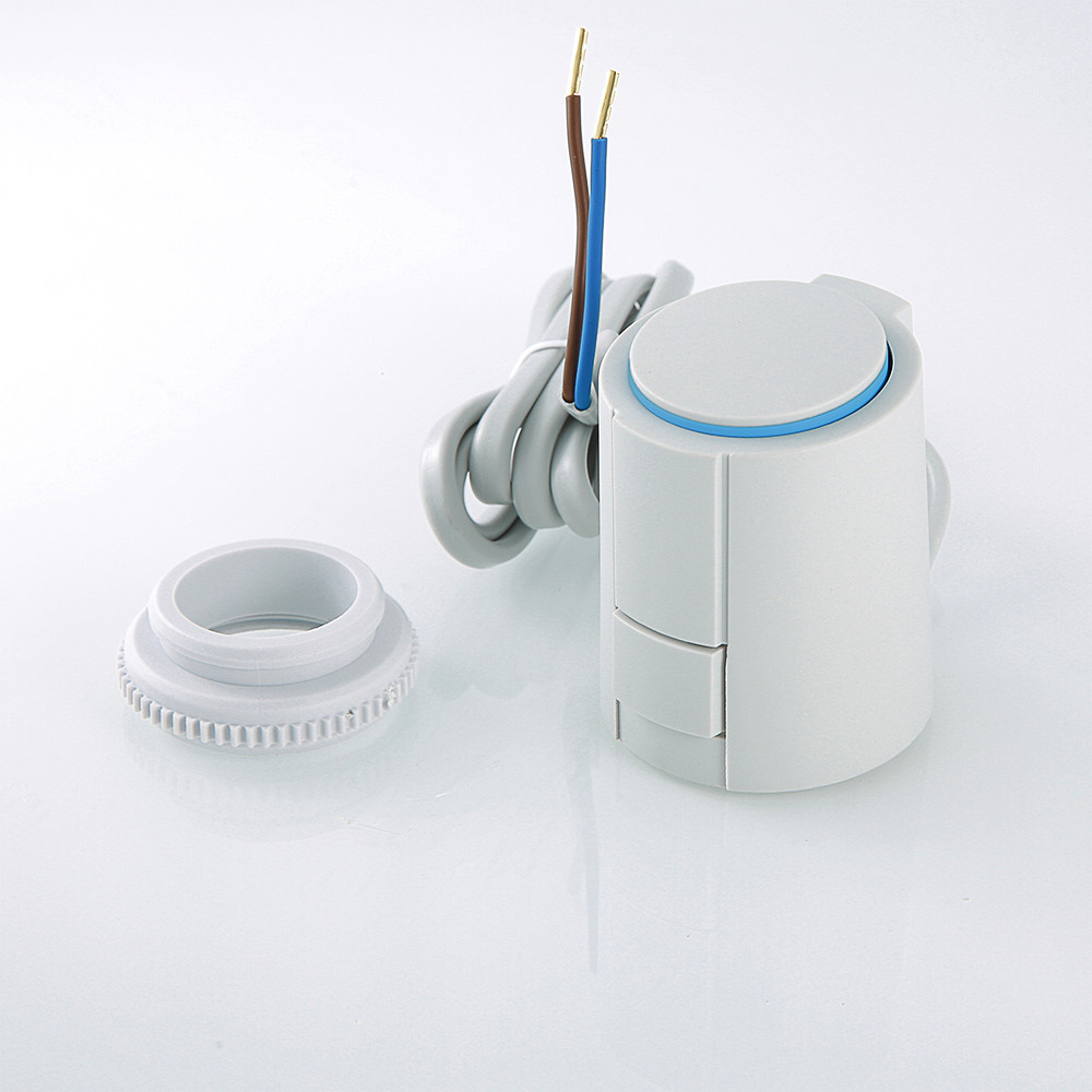Привод для автоматического управления радиаторным или коллекторным термостатическим клапаном систем водяного отопления (водяной теплый пол) и охлаждения зданий по сигналу от термостата, датчика или контроллера. Действие основано на расширении заполняющего сильфон армированного парафина при протекании электрического тока через встроенный нагревательный элемент. Нормально открытый. Присоединение сервопривода к клапану – через переходник (в комплекте).
