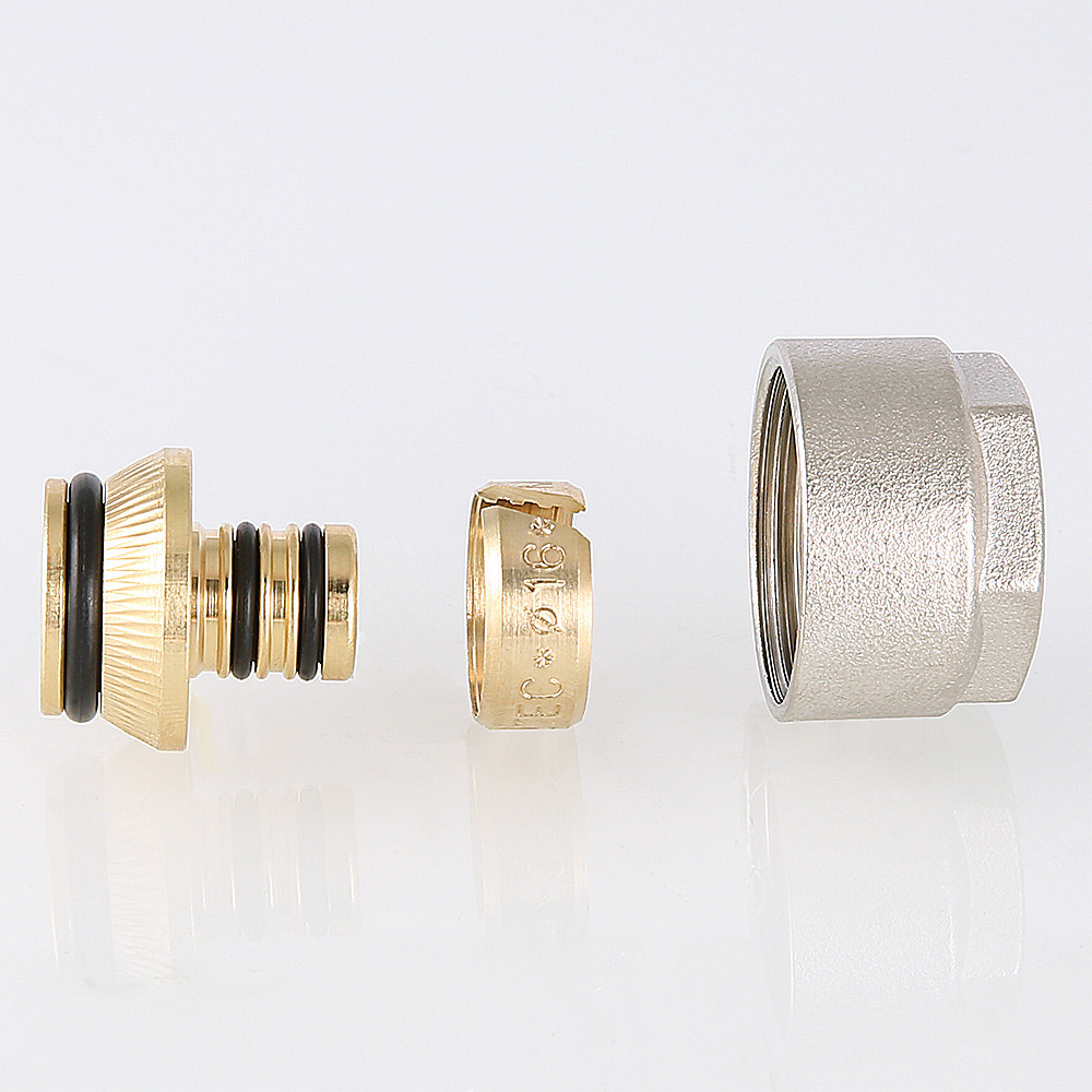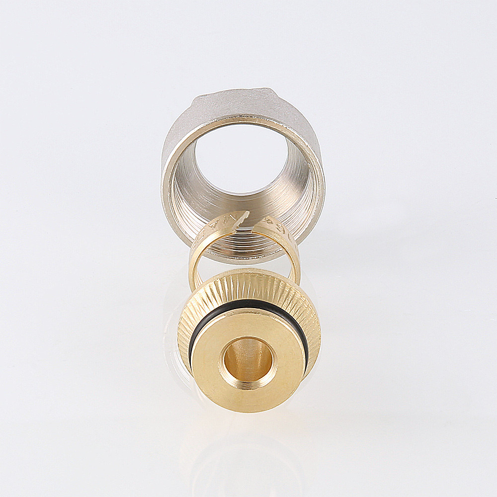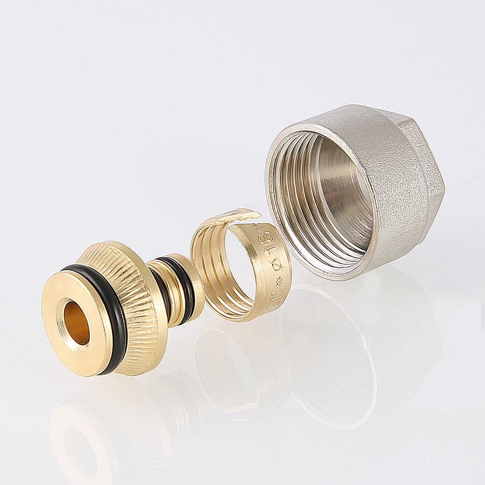 Латунный фитинг с накидной гайкой и обжимным кольцом для подключения металлополимерной трубы к коллектору VALTEC с выходами диаметром 3/4", стандарт соединения – «евроконус».