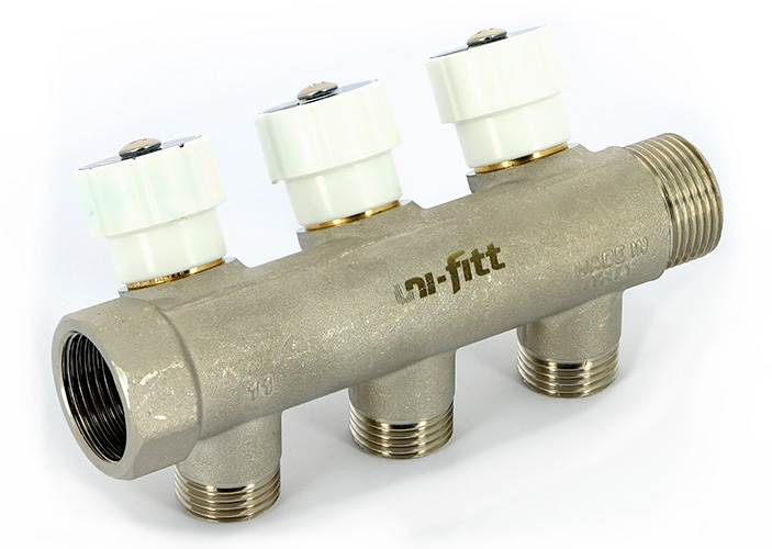 Коллектор Uni-Fitt НВ 3/4' 3 вых. х 1/2' Н под плоскую прокладку 40мм никелированный с вентилями