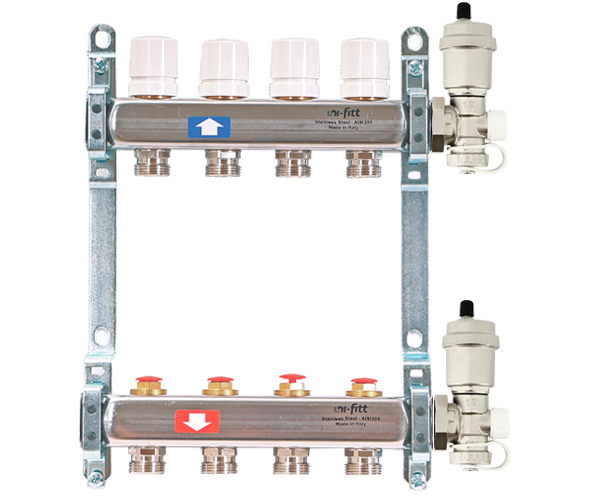 Коллекторные группы Uni-Fitt предназначены для распределения и регулирования потоков теплоносителя в низко- или высокотемпературных системах отопления. Оснащены балансировочными вентилями на подающем коллекторе и термостатическими вентилями (с возможностью установки термоэлектрических приводов) на обратном коллекторе. Каждое изделие укомплектовано автоматическими воздухоотводчиками.
