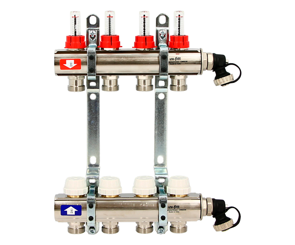 Коллекторные группы Uni-Fitt предназначены для распределения и регулирования потоков теплоносителя в низко- или высокотемпературных системах отопления. Оснащены расходомерами на подающем коллекторе и термостатическими вентилями (с возможностью установки термоэлектрических приводов) на обратном коллекторе. Каждое изделие укомплектовано дренажным клапаном / воздухоотводчиком, который может быть использован для заполнения системы.