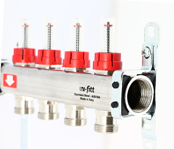 Коллекторные группы Uni-Fitt предназначены для распределения и регулирования потоков теплоносителя в низко- или высокотемпературных системах отопления. Оснащены расходомерами на подающем коллекторе и термостатическими вентилями (с возможностью установки термоэлектрических приводов) на обратном коллекторе.
