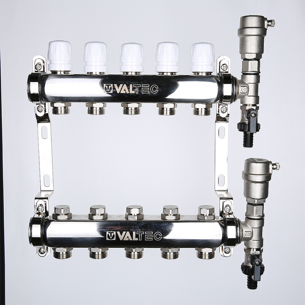 Коллекторный блок из нержавеющей стали VALTEC с регулировочными и балансировочными клапанами 1" х 5 выхода "евроконус" 3/4"