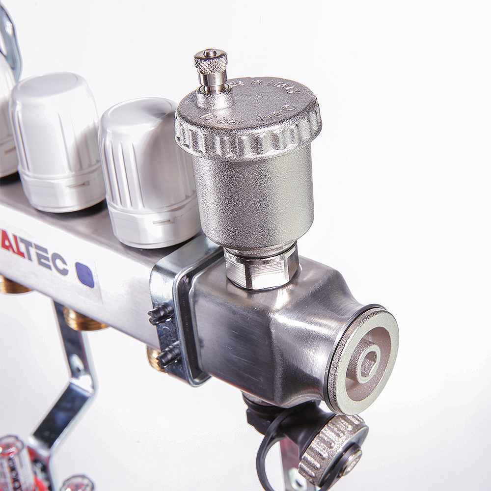 Коллекторные блоки для распределения теплоносителя по петлям теплого пола или по приборам отопления. Выходы подающего коллектора укомплектованы ручными регулировочными клапанами с расходомерами, обратного – ручными запорными клапанами, на которые можно установить электротермические сервоприводы. Каждый коллектор имеет автоматический воздухоотводчик и дренажный клапан.