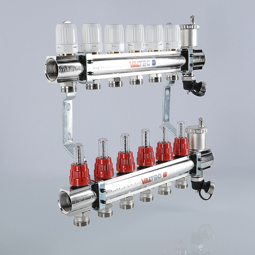 Коллекторный блок латунный VALTEC с регулировочными клапанами и расходомерами 1" х 9 выходов "евроконус" 3/4"