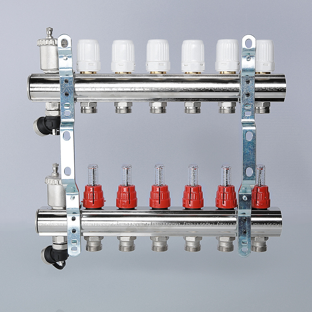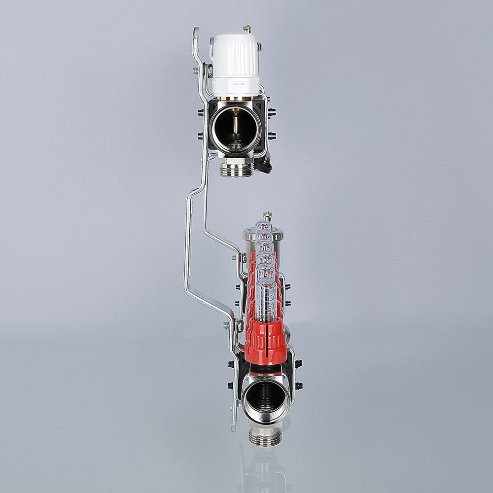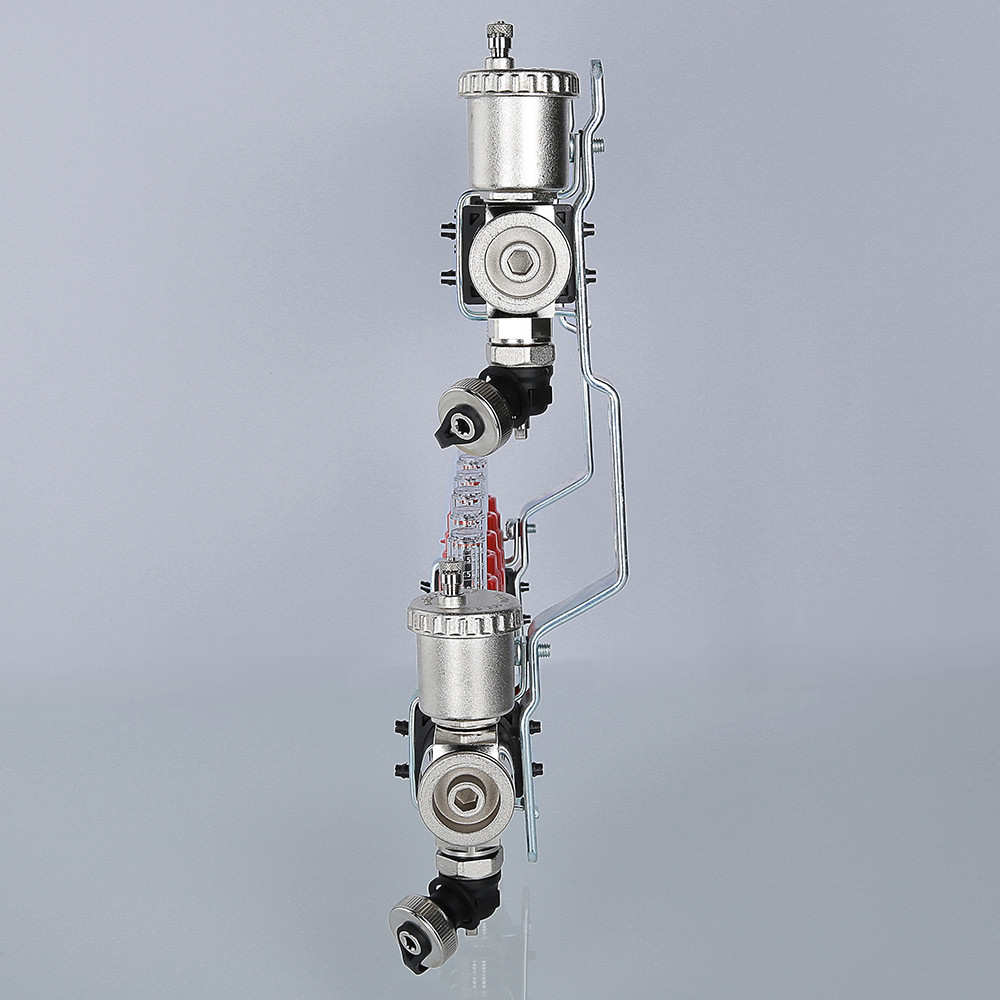 На выходах прямого коллектора установлены настроечные клапаны с расходомерами, обратный коллектор оснащен регулировочными клапанами (ручные, с возможностью оборудования сервоприводами).