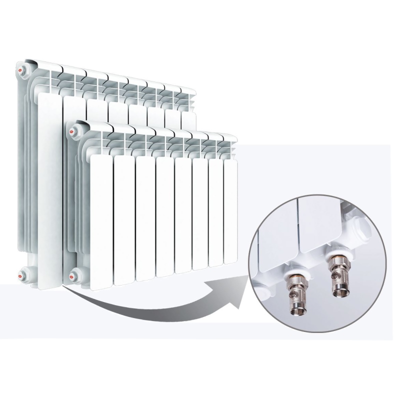 Специально для нижнего подключения разработано конструктивное исполнение алюминиевых и биметаллических радиаторов. Такое исполнение имеет обозначение VENTIL. В зависимости от выбранной модели после сборки радиатор сохраняет все ее теплотехнические и эксплуатационные характеристики. При разработке проекта системы отопления необходимо учесть гидравлические особенности узла нижнего подключения и термостатического клапана согласно оговоренной комплектации.
