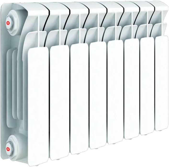 Каждая секция биметаллического радиатора состоит из внутренней стальной части в виде вертикально расположенных трубок, а сверху закреплены алюминиевые пластины;
